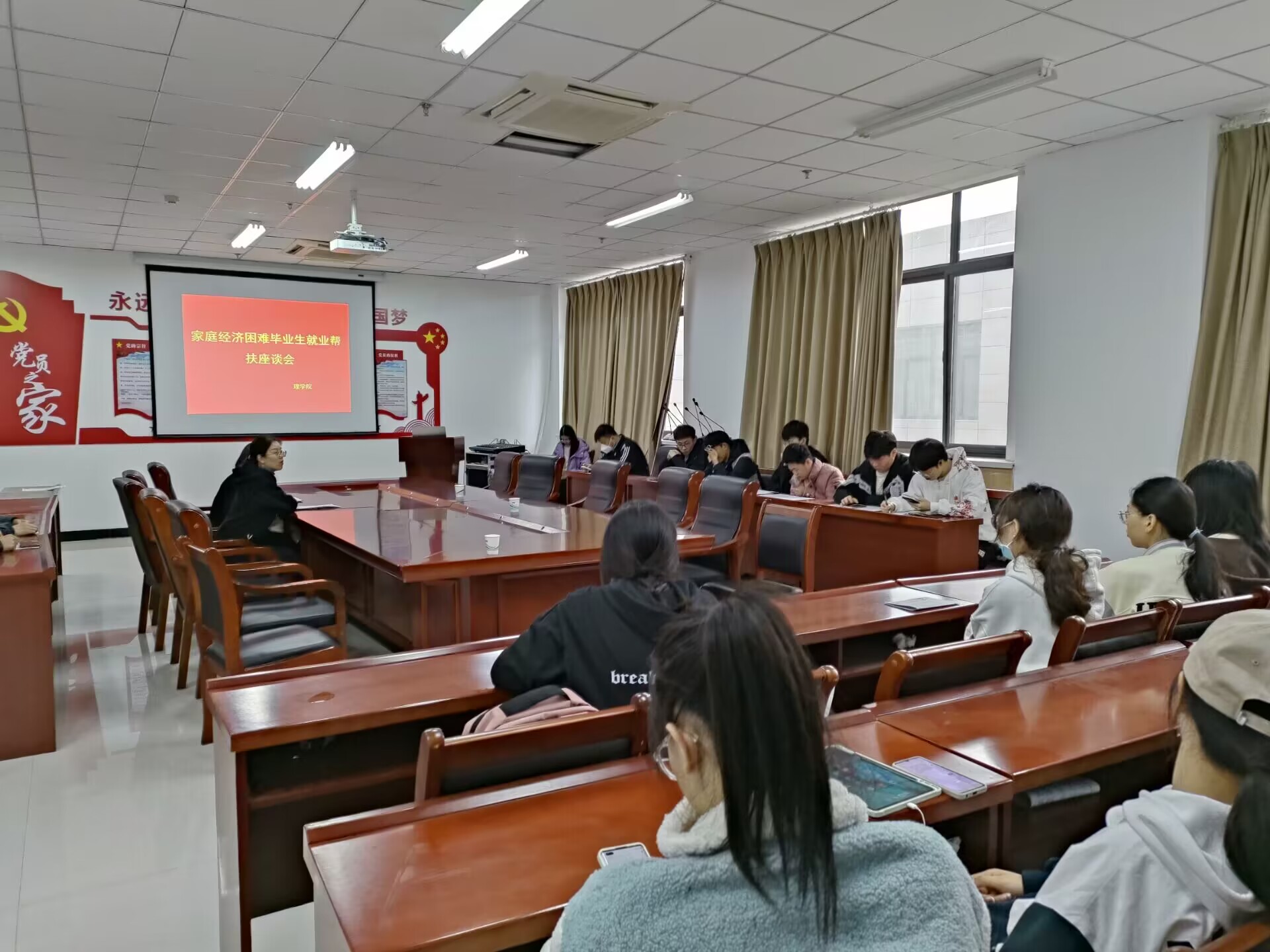 于实训楼308会议室召开2023届就业困难毕业生帮扶座谈会。学院党委副书记吴春阳、毕业班辅导员刘姗以及就业困难毕业生代表参会。
