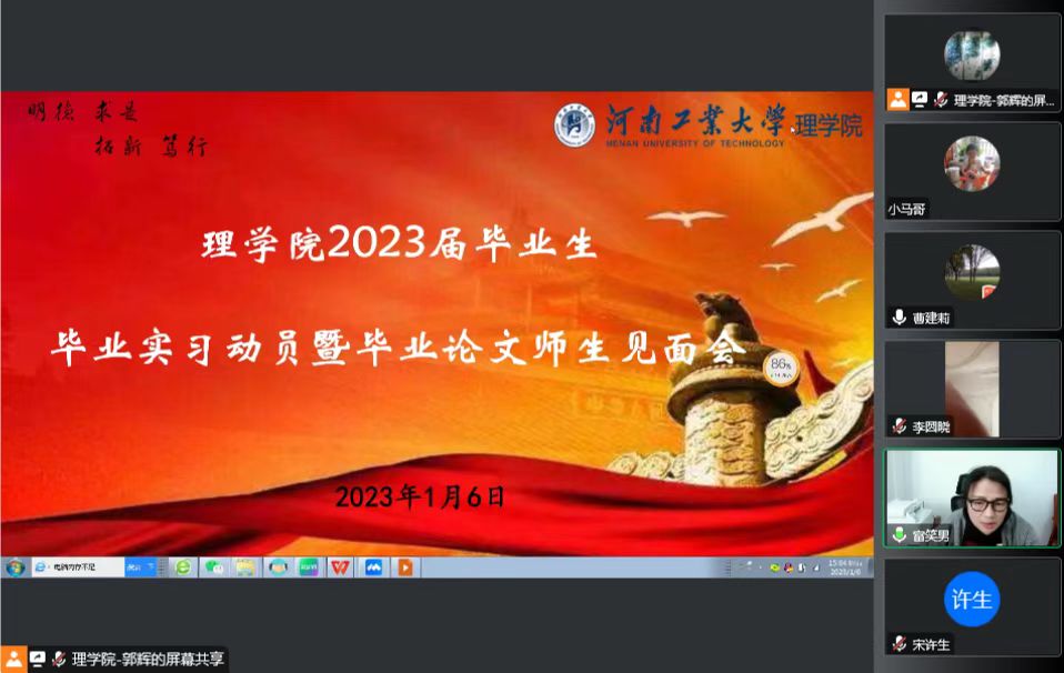 于2023年1月6日下午召开2023届毕业生毕业实习暨毕业论文师生线上见面会。学院全体教师和2023届毕业生参加了会议。会议由副院长曹建莉主持。