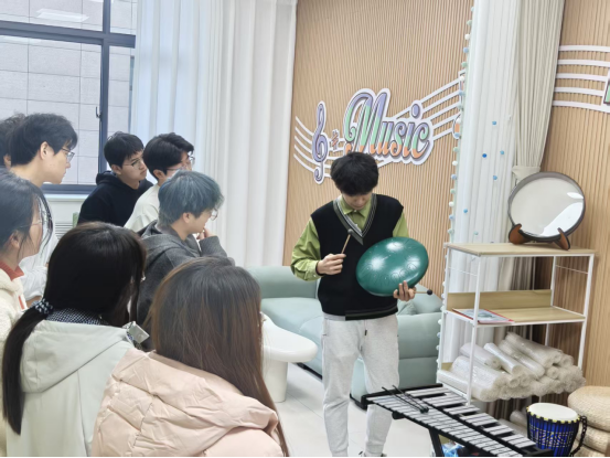 在核心体验环节,活动设置了“音乐冥想”“情绪旋律创作”“团体音乐故事”三个模块。在“音乐冥想”中,周老师播放精心挑选的自然音效与轻音乐,引导学生闭上眼睛调整呼吸,将注意力集中于旋律与自身感受,让紧绷的神经在空灵的音乐中慢慢放松。不少学生表示,“随着音乐的流动,感觉学习带来的疲惫感都消散了,内心特别平静”。
