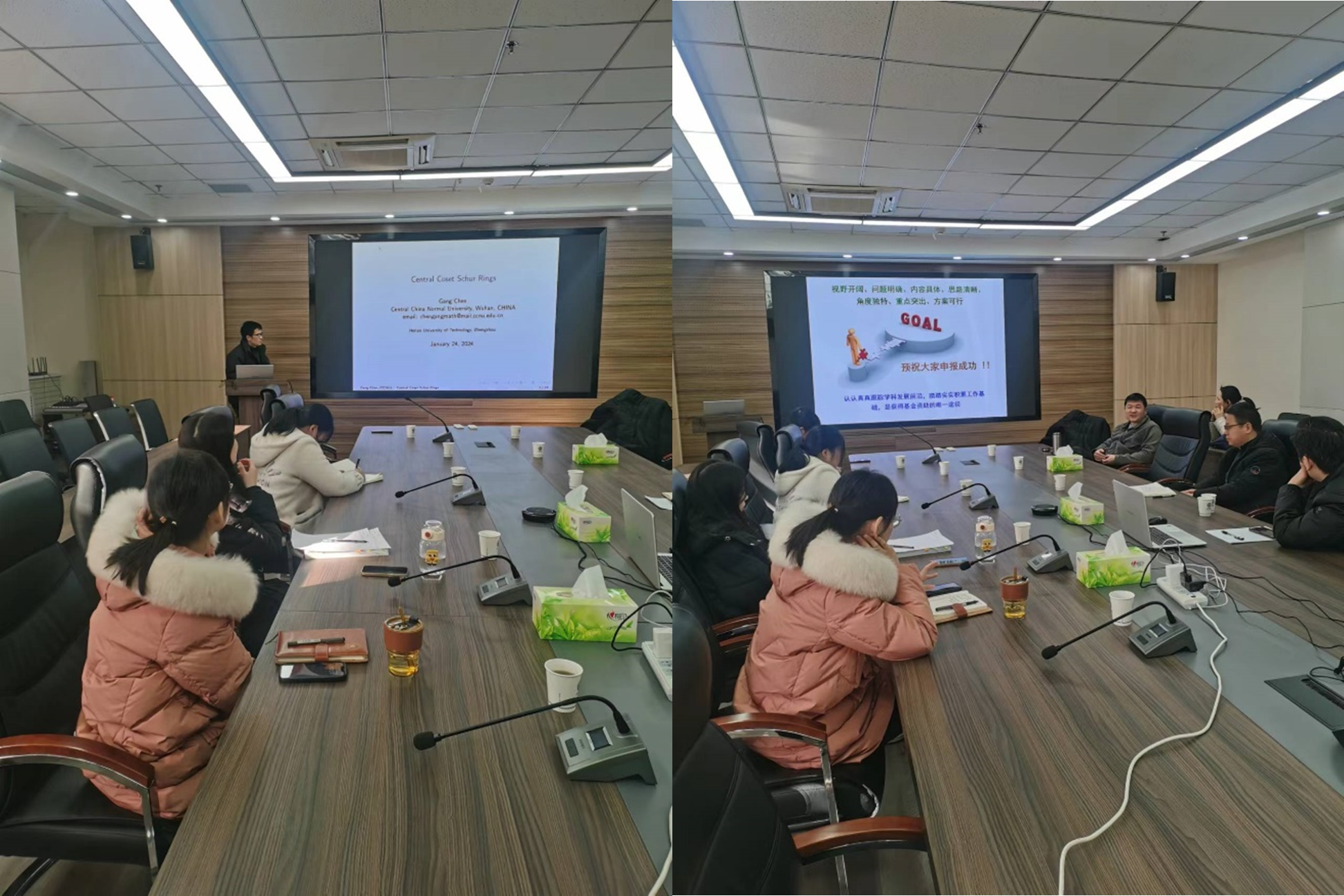 会议分为两个阶段。第一个阶段为学术报告会,缪龙教授做了题为“关于有限非可解群中的二极大子群的研究”的学术报告,陈刚教授做了题为“On central coset Schur rings”的学术报告,并分别和大家分享了做科研的经验和体会。报告结束后,与会教师和两位教授进行了深入讨论,大家受益匪浅。第二个阶段为国家基金论证会,缪龙和陈刚两位教授分别做了“国家自然科学基金申请体会”的报告,解读了2024年国家自然科学基金的政策要求,并对申请书各部分的撰写要点进行说明,提供了具体的撰写方法,无私分享了自己的撰写经验和体会。代数学方向的申报老师汇报了自己的申报课题,各位专家分别针对申报书的不足提出了合理的修改意见和建议,参会教师与受邀专家进行积极交流,会场气氛热烈。
